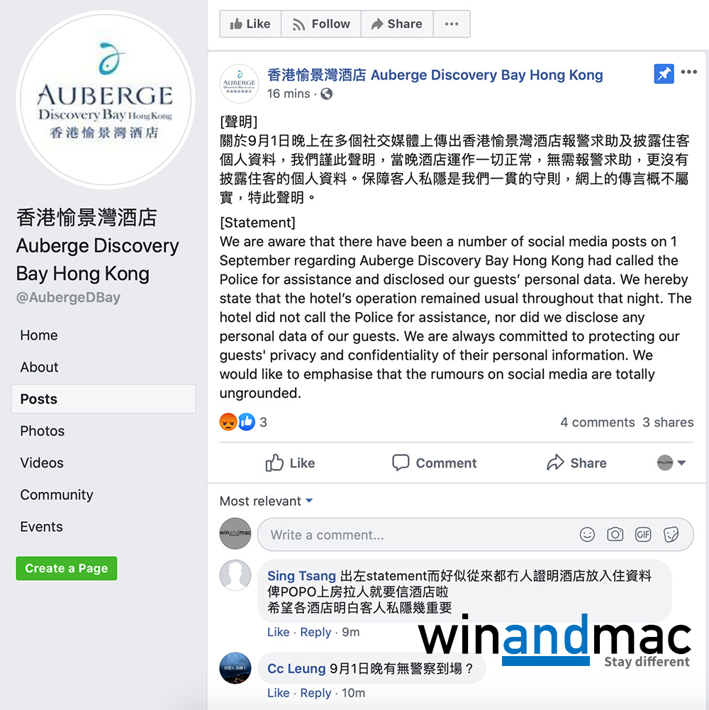 位於大嶼山的香港愉景灣酒店早前疑因為看到有抗爭者入住,便馬上報警拉人,被網民罵爆。雖然後來有職員澄清,但很多人也不相信。現在,官方也於Facebook Page發表文章,力證沒有洩露住戶私隱,稱當晚酒店運作一切正常,無需報警求助。