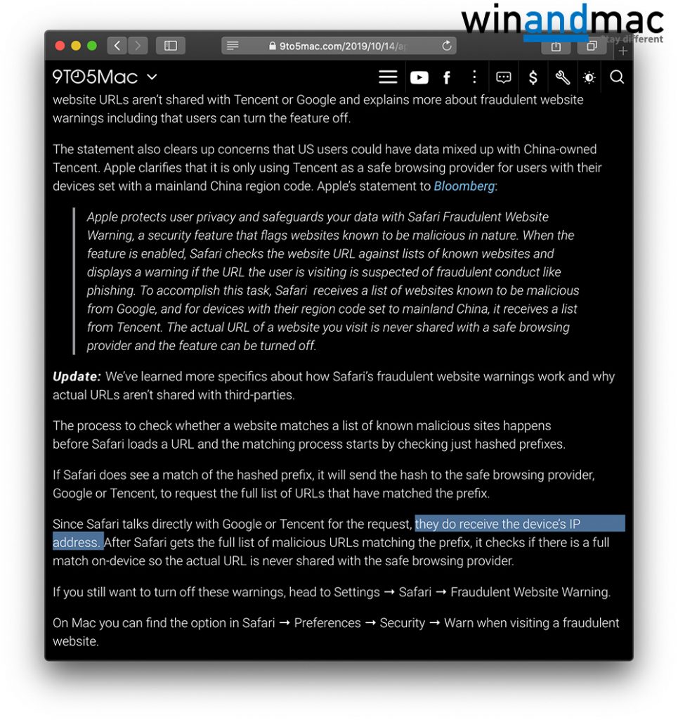不只winandmac Media,很多科技網站或新聞網站都有報道蘋果iOS Safari自動把用家的瀏覽私隱「送中」。因為當中寫明,預設開啟的「詐騙網站警告」功能,會把用家的私隱傳送至大陸騰訊和Google。當時不少網站包括我們,都有示範如何把有關設定關閉。如今,蘋果終於就此事作出回應。