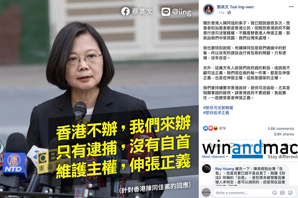 蔡英文強調要提供司法協助,要求香港政府不要迴避,負起責任和伸張正義。對於有人說她不正義,又或過於軟弱,蔡英文稱「都是在伸張正義,也是在伸張主權,這就是國家的主權。以下是相關原文: