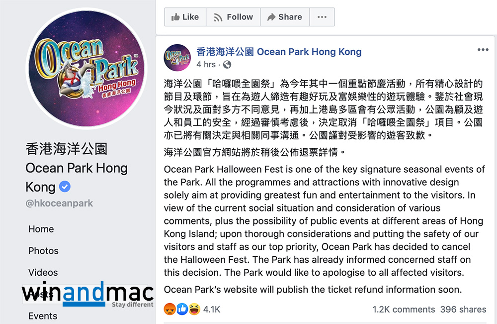 海洋公園稱,由於社會現今狀況和面對多方不同意見,再加上港島多區將會有公眾活動,他們為了遊人和員工的安全,決定取消「哈囉喂全園祭」項目。他們將於稍後時間在網站公佈退票詳情。