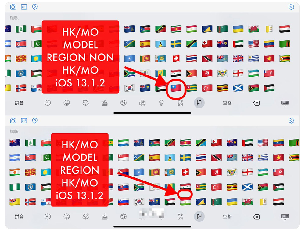 這種情況過往只在大陸售賣的iPhone出現,有指蘋果為了避免激嬲中國,故此不承認台灣國,大陸版iPhone不會看到台灣旗。自從iOS 13.1.2後,澳門和香港所售賣的iPhone的表情圖案鍵盤,也再不會看到台灣國旗。用家要在鍵盤上輸入台灣或Taiwan,才會看到台灣旗的表情圖案。