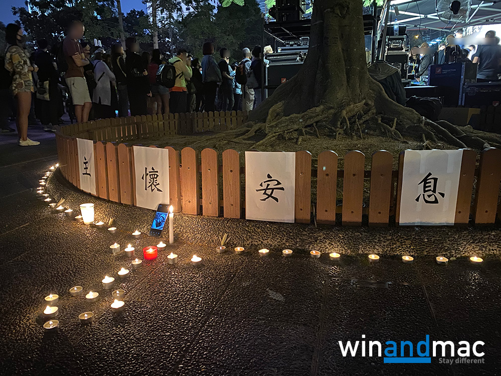 燭光前有「主懷安息」四隻字,並有一部手機展示周梓樂生前的相片。