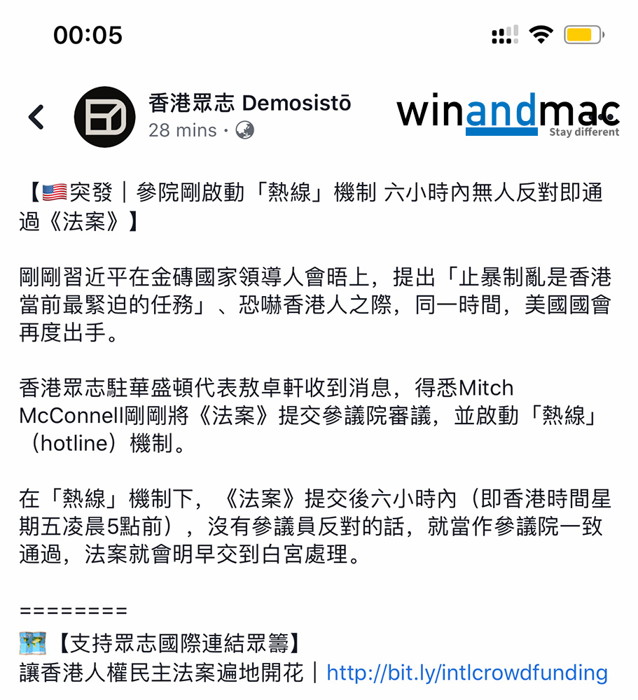 香港眾志駐華盛頓代表敖卓軒收到消息,得悉參議院多數黨領袖 Mitch McConnell 剛剛將《香港人權及民主法案》提交大會審議,並啟動最快速的「熱線」(hotline)機制。