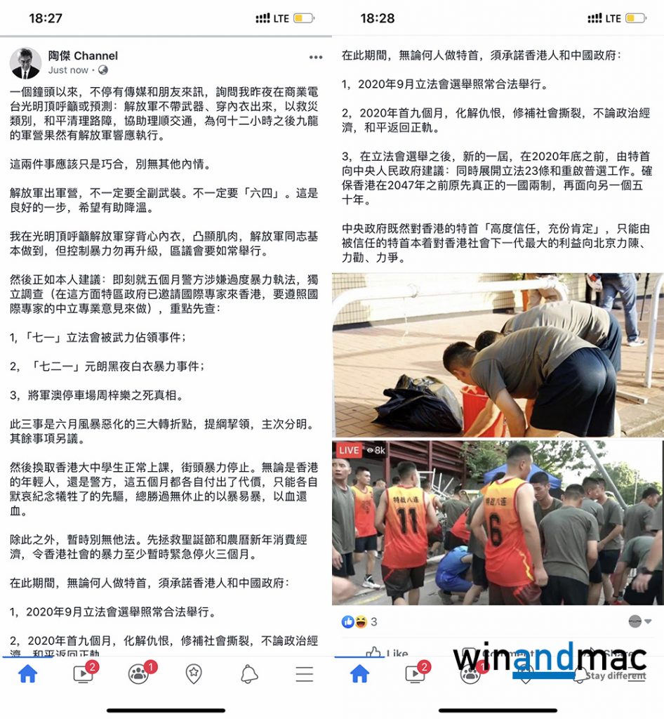 解放軍今日較早前正式在浸大出現,幫手清路障,被人認為是明目張膽的解放軍治港。但有更多人發現,陶傑在今天解放軍出動前,曾在光明頂有相同建議。他在光明頂電台節目中,為中國拆局,稱第一步就是「解放軍不帶任何裝備、不矇面,只穿背心,清除路面雜物」。對於是否有內情,陶傑極速回應稱:「這兩件事應該只是巧合,別無其他內情。」