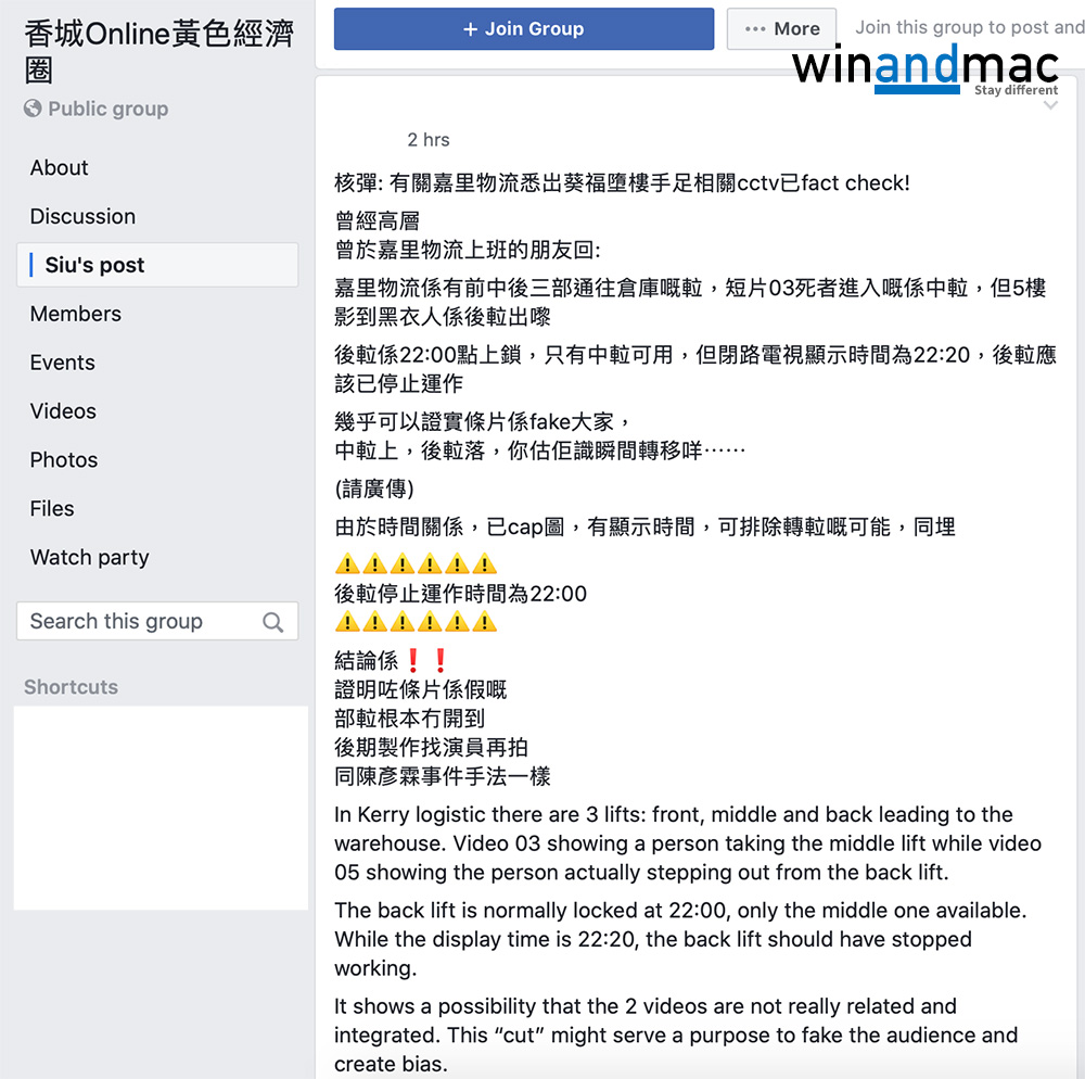 網民稱有關地方的鎖????時間和事發時間有點不對,「嘉里物流係有前中後三部通往倉庫嘅????,短片03死者進入嘅係中????,但5樓影到黑衣人係後????出嚟」,另後????是在晚上十點上鎖,只有中????可用,但閉路電視「顯示時間為22:20,後????應該已停止運作」。此外,網民續指「中????上,後????落,你估佢識瞬間轉移咩⋯⋯」