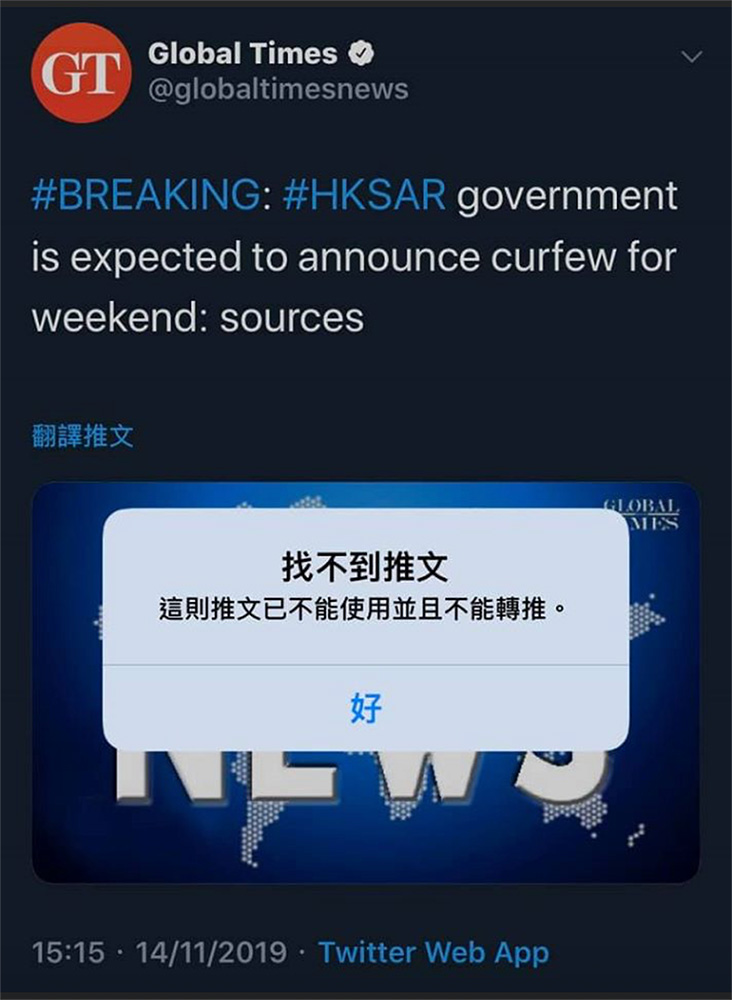 有人擷取了相關圖片,但當時Tweet已經被環球時報刪除,有關Tweet原文是消息指出政府預計將公佈週六日宵禁。如今被刪除後,Bloomberg也有相關報道。