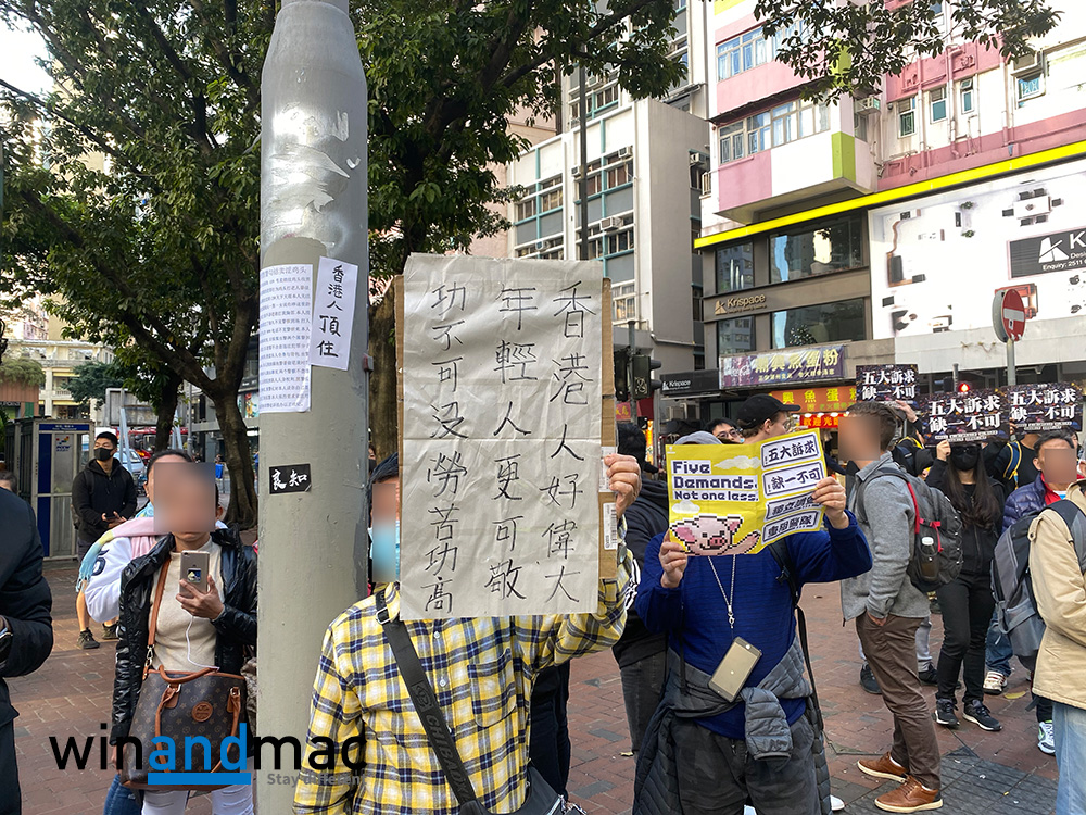 年紀大一點的,雖然未必能一起同行,但也不忘舉起示威標語,寫道「香港人好偉大,年輕人更可敬,功不可沒勞苦功高」,給年輕人一點的支持。