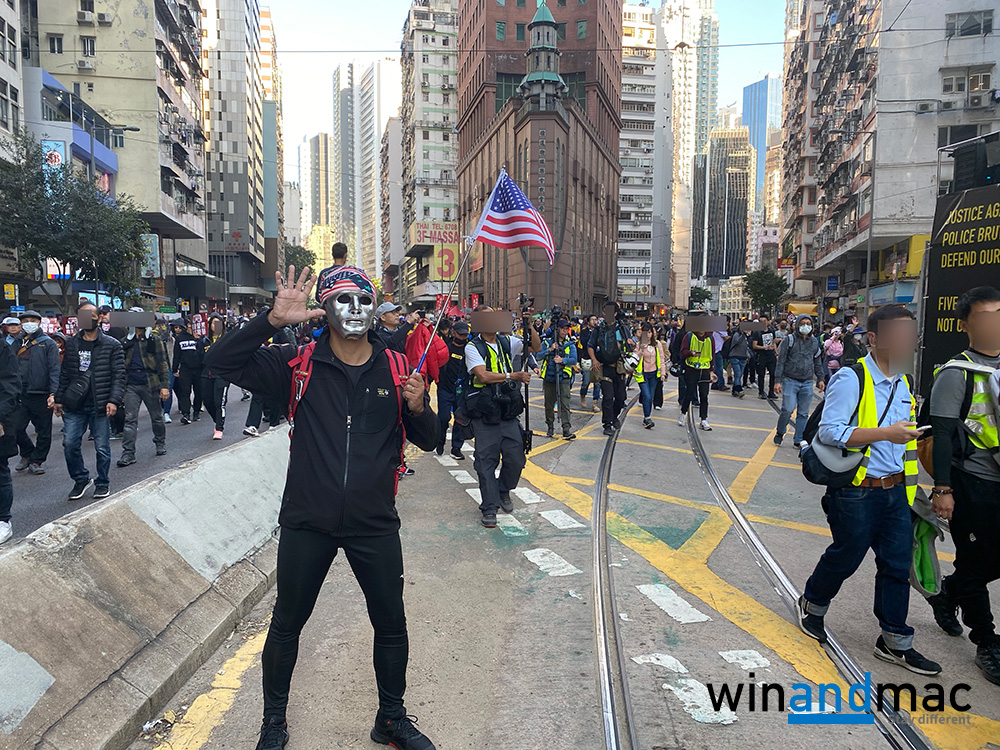 有抗爭者戴著面具以及美國國旗,多謝美國通過香港人權與民主法案。