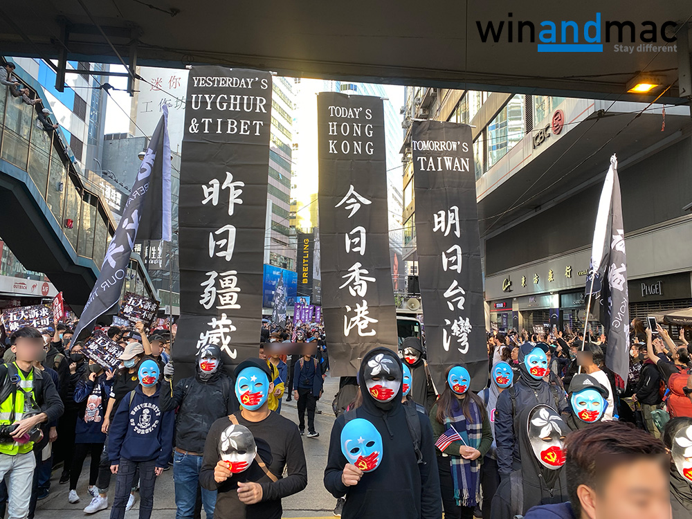 民陣強調,他們明白就算區選勝利,大家仍然要爭取,因為五大訴求仍然未達到,林鄭仍然扮聽唔到。與香港同行時,也與疆藏同行。隊頭有人帶著「昨日疆藏、今日香港、明日台灣」,面具也可看到一些意義。