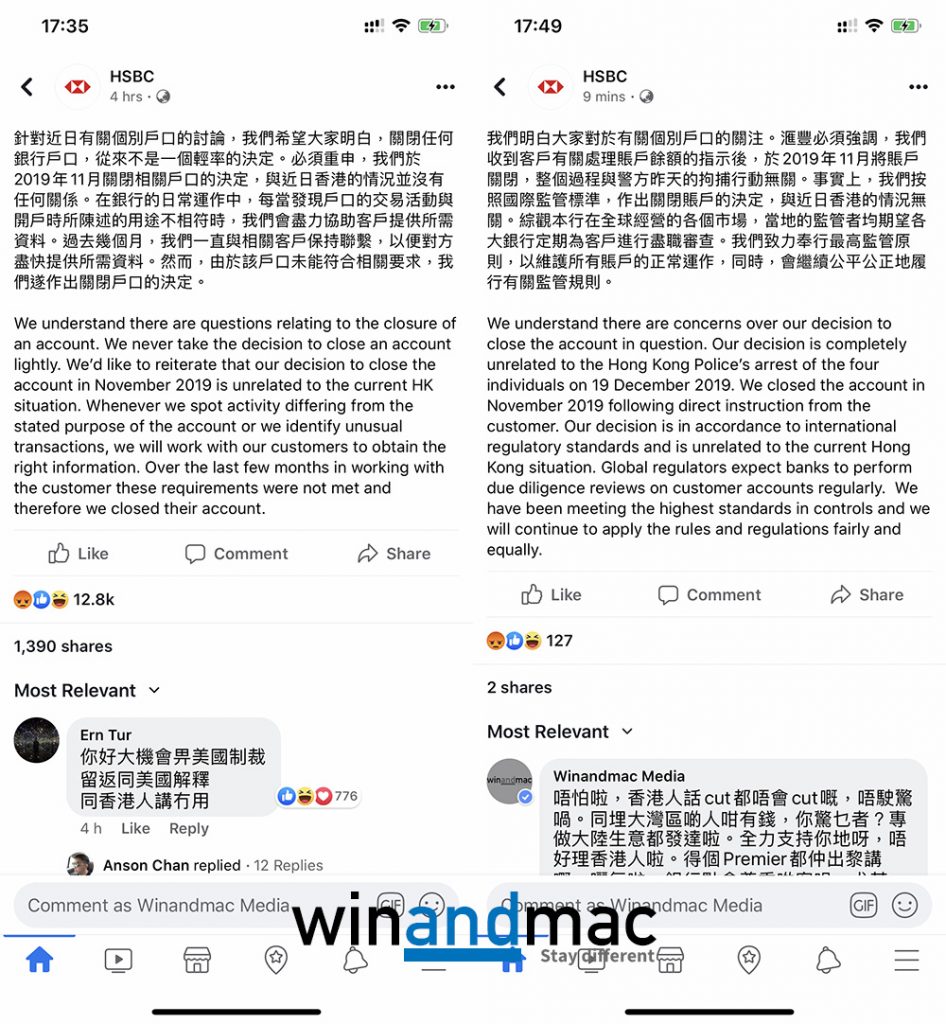 很多網友在滙豐Facebook Fan Page中,聲稱會取消戶口。事實上,滙豐近幾年力推大灣區的業務,相信香港人就算全數取消戶口,對他們影響極微。以下是第一段滙豐回應: