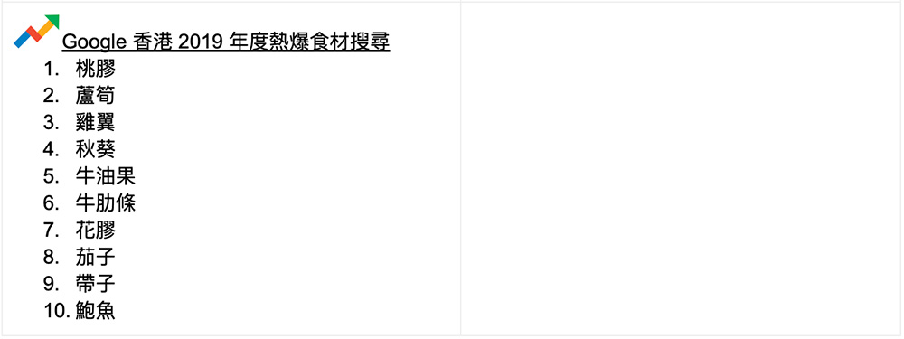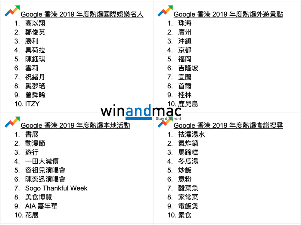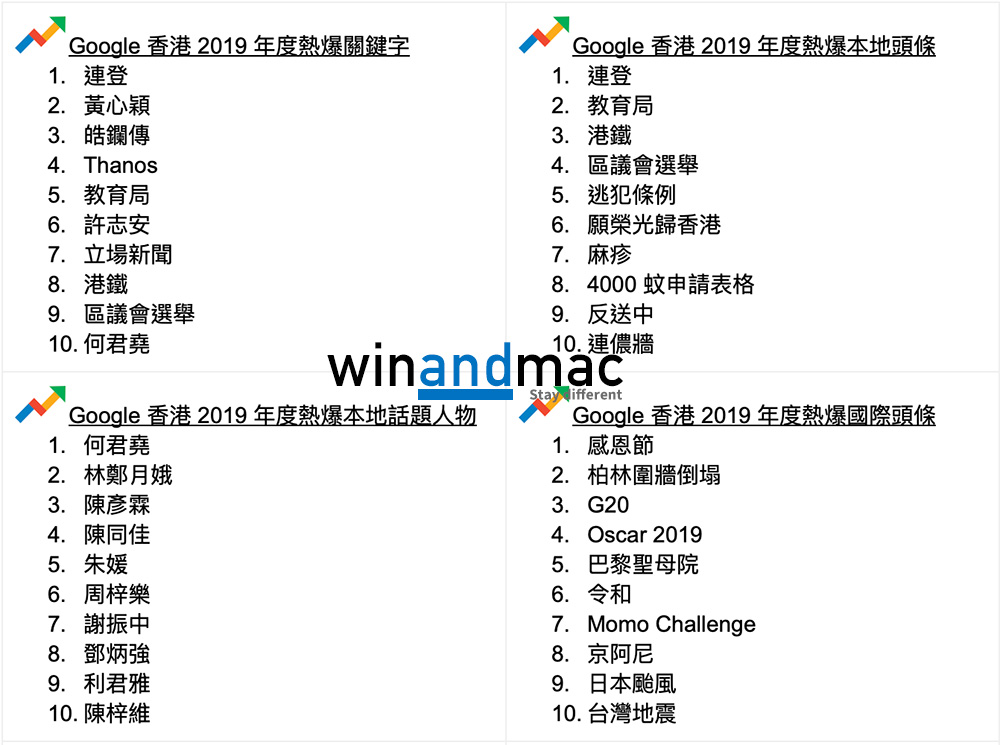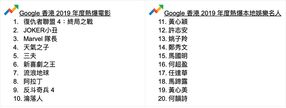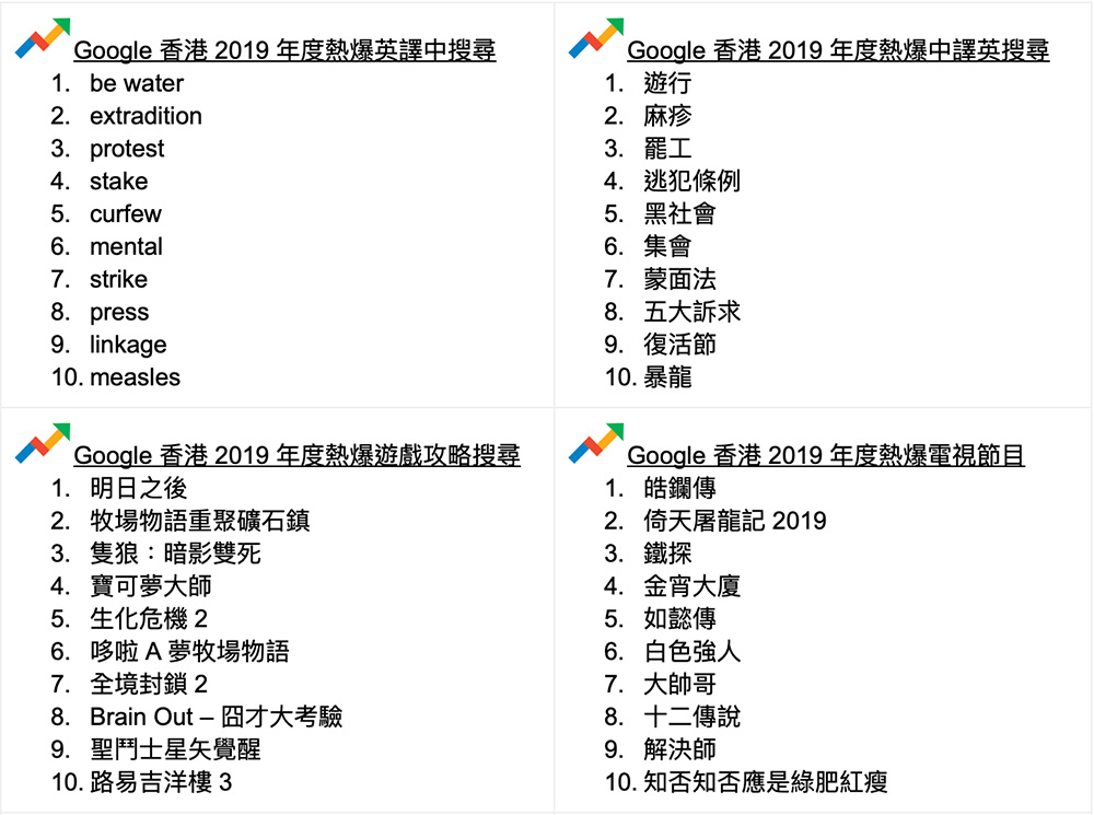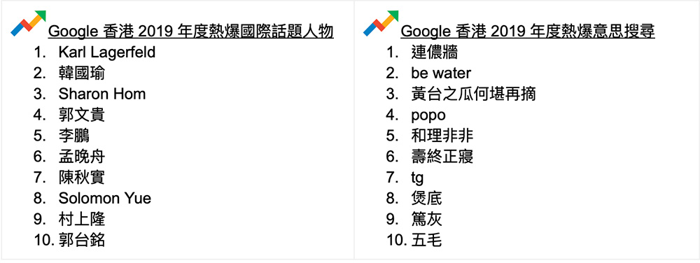 由以往的Yahoo到現在的Google,搜尋器是我們每天幾乎都會瀏覽和使用的網站之一。Google香港今年宣佈2019年的搜尋榜,當中2019年度熱爆關鍵字,不少都是與時事有關。排第一位是大家熟識的連登,而第二位已經是娛樂新聞黃心穎。值得一提的是,Google今次的一系列數據排行榜,都可以看到不少與時事有關,包括人物有何君堯,熱爆意思搜尋亦有連儂牆、黃台之瓜何堪再摘、be water等。