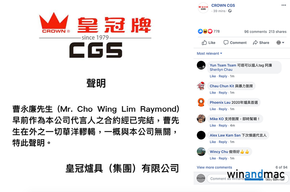 曾經找支持警察的曹永廉做了多年代言人的皇冠爐具,於數分鐘前發表聲明,稱與曹永廉的合作早就完結。不少網民都笑言會買多幾個放係屋企,亦有不少人笑言「咁快就割蓆」。