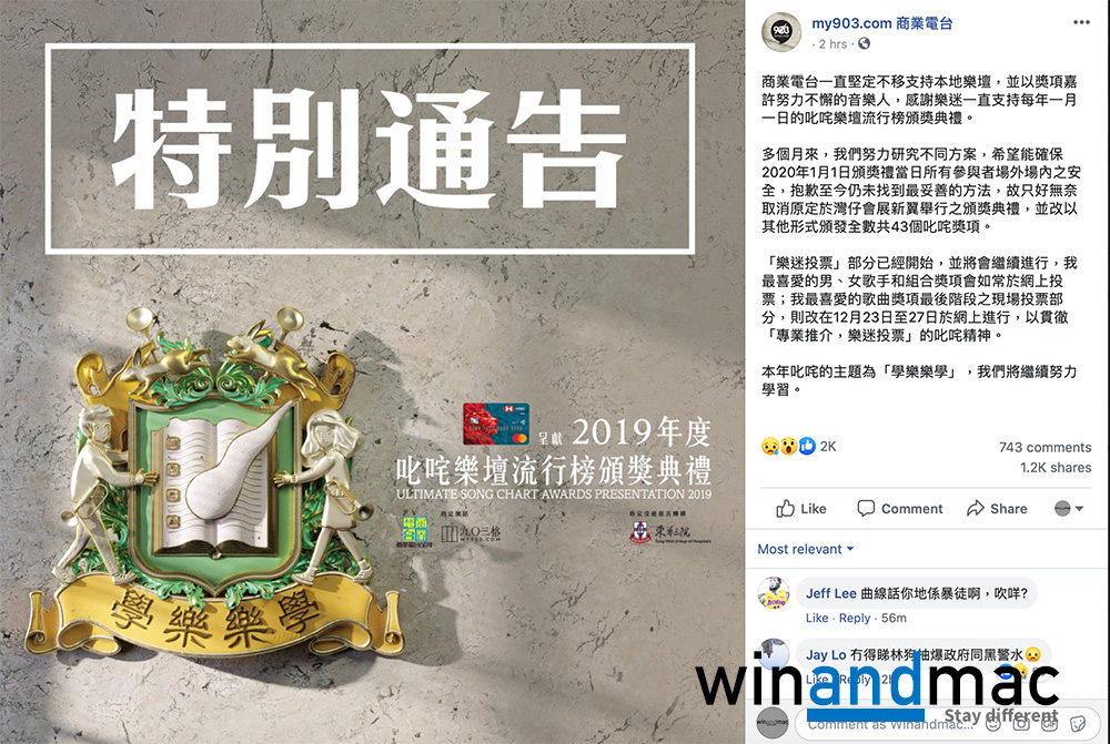 多個月來,我們努力研究不同方案,希望能確保2020年1月1日頒獎禮當日所有參與者場外場內之安全,抱歉至今仍未找到最妥善的方法,故只好無奈取消原定於灣仔會展新翼舉行之頒獎典禮,並改以其他形式頒發全數共43個叱咤獎項。