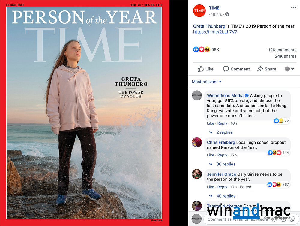 曾經在公開場合講過How dare you的瑞典環保少女通貝里Greta Thunberg,成功當選2019年Time時代雜誌的Person of the Year 2019風雲人物。雖然香港示威者本來獲得讀者高票數支持,但時代雜誌最後決定選擇瑞典環保少女通貝里。