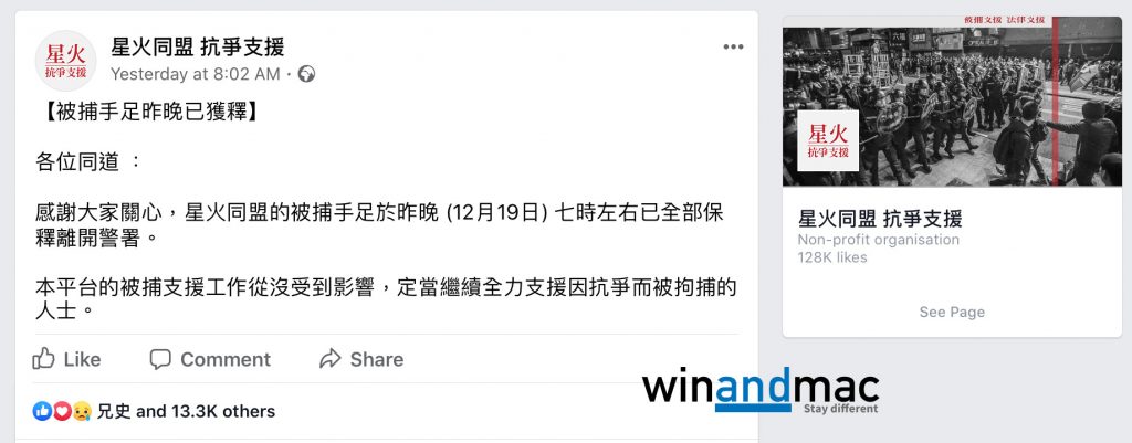 感謝大家關心,星火同盟的被捕手足於昨晚 (12月19日) 七時左右已全部保釋離開警署。