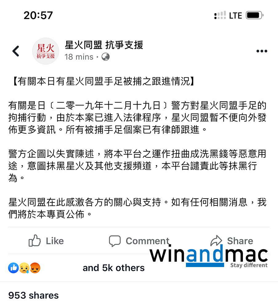 今日較早前,警方拘捕四名星火同盟的人,凍結七千萬資金,並指他們洗黑錢。當時有人還指未必是大家熟識的星火同盟,但結果真的是支援被捕抗爭人士的星火同盟。他們在Facebook上公佈最新情況,稱所有被捕人士有律師跟進。目前不便公佈更多資訊,但就警方指他們洗黑錢等惡意用途,提出強烈譴責。