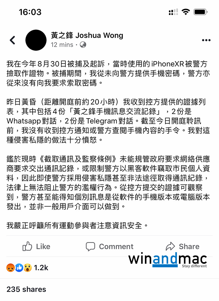 昨日黃昏(距離開庭前約20小時)我收到控方提供的證據列表,其中包括4份「黃之鋒手機訊息交流記錄」,2份是Whatsapp對話,2份是Telegram對話。截至今日開庭聆訊前,我沒有收到控方通知或警方查閱手機內容的手令。我對這種侵害私隱的做法十分憤怒。