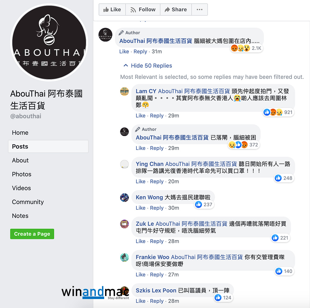 阿布泰國生活百貨Facebook曾出post求助,幸好在擾攘一段時間後,以及一班網民幫忙下,終於成功逃離。有網民建議,由明天起應該只賣給懂得「光復香港,時代革命」口號的顧客。