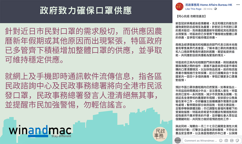 網上有傳言指,各區的民政事務署會免費向市民派發口罩。由於口罩仍然難求,再加上早前有人要求政府派發,很多人以為政府轉死性,真的聽大家訴求。結果,有關傳言並非真實,民政事務總署還提一提市民,要市民提高警惕,勿輕信謠言。