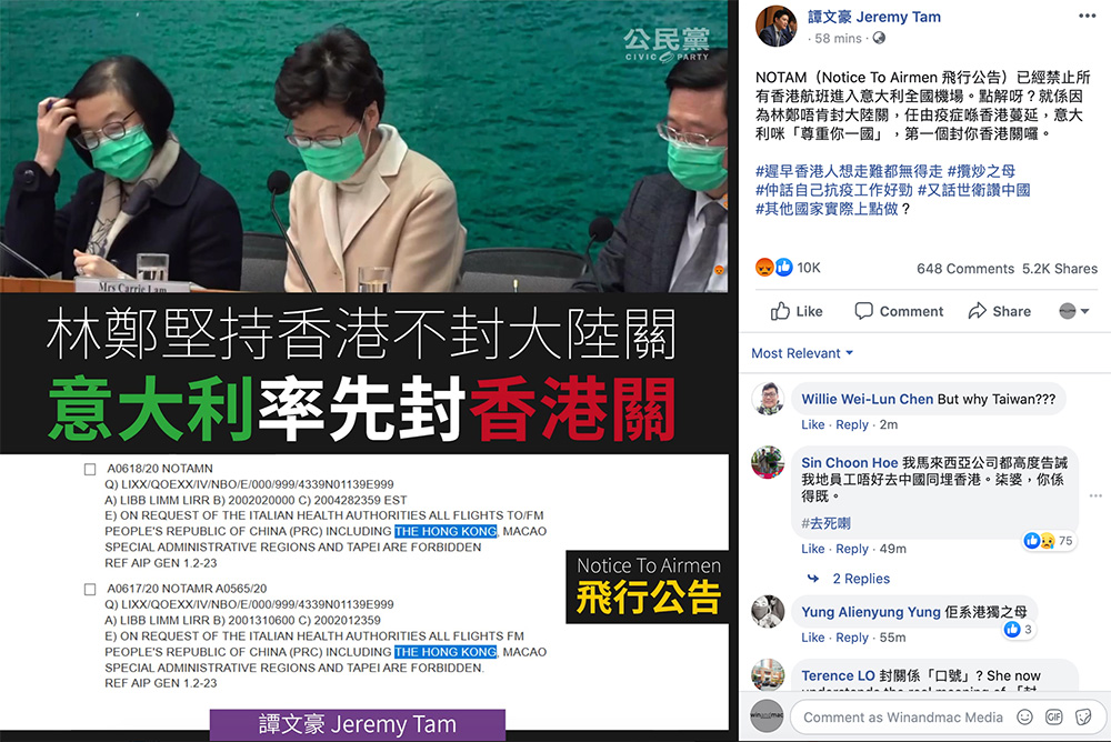 譚文豪都擔心香港人萬一要走難都會相當困難,並寫到「其他國家實際上點做」。值得一提的是,今次意大利全國機場除了封中國和香港外,也禁止來自台北的航班。