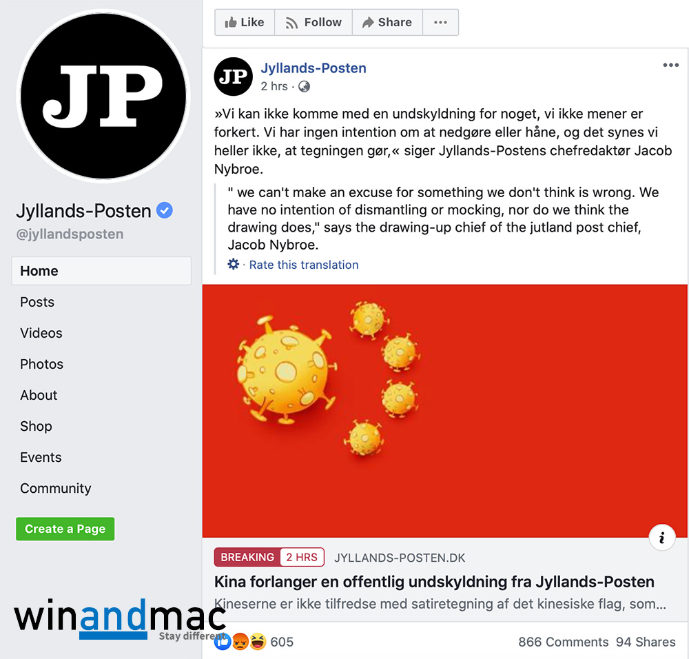 武漢肺炎擴散全球,其中一個原因是因為中國隱瞞病情,沒有第一時間控制。丹麥日德蘭郵報Jyllands Posten亦唔太客氣,早前畫了一幅Dagens tegning: Coronavirus畫,把中國五星旗換成五個病毒,結果當然引發中國不滿。