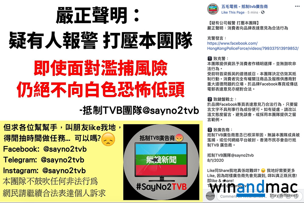 自反送中運動以來,有不少網民呼籲抵制撐警或政府的品牌,更有人發起進一步行動,若有廣告商付錢給無綫等撐警,也會進行杯葛。如今,有被抵制的TVB廣告商竟然報警,製造白色恐怖。發起運動的專頁稱,消費者向品牌表達意見為合法行為。