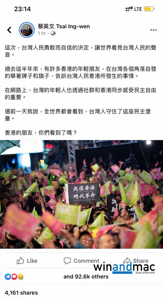 她提到過去這半年,很多香港人在台灣不同的角落,告訴台灣人發生什麼事。蔡英文認為,台灣的年輕人和香港人都在網絡上感受到民主自由的重要性。她提到台灣成功守住,「香港的朋友,你們看到了嗎?」。配圖更用上香港人在其競選總部拿著旗幟的相片。
