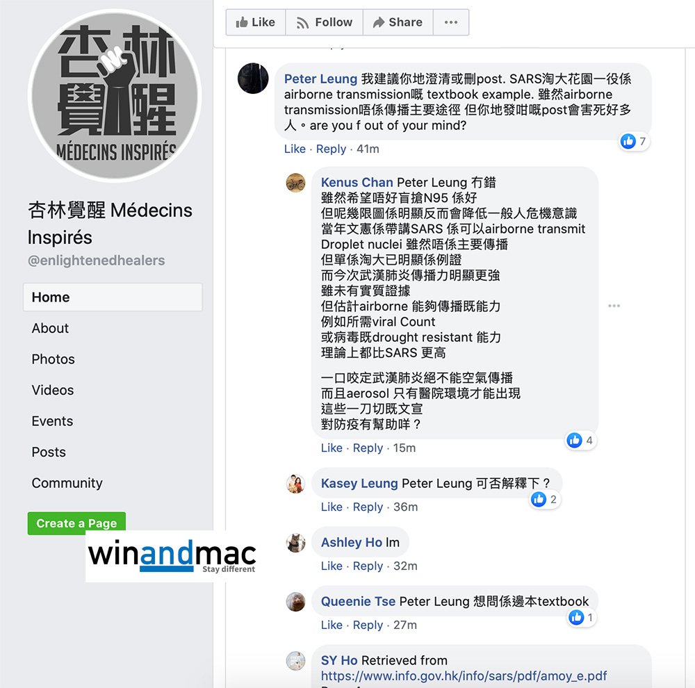 可是,有網民留言引用SARS例子,稱杏林覺醒的內容不正確,有網民甚至更罵這樣害死人,要求刪除文章。該名網民指不能一口咬定武漢肺炎絕不能空氣傳播,只認同不要盲搶N95。