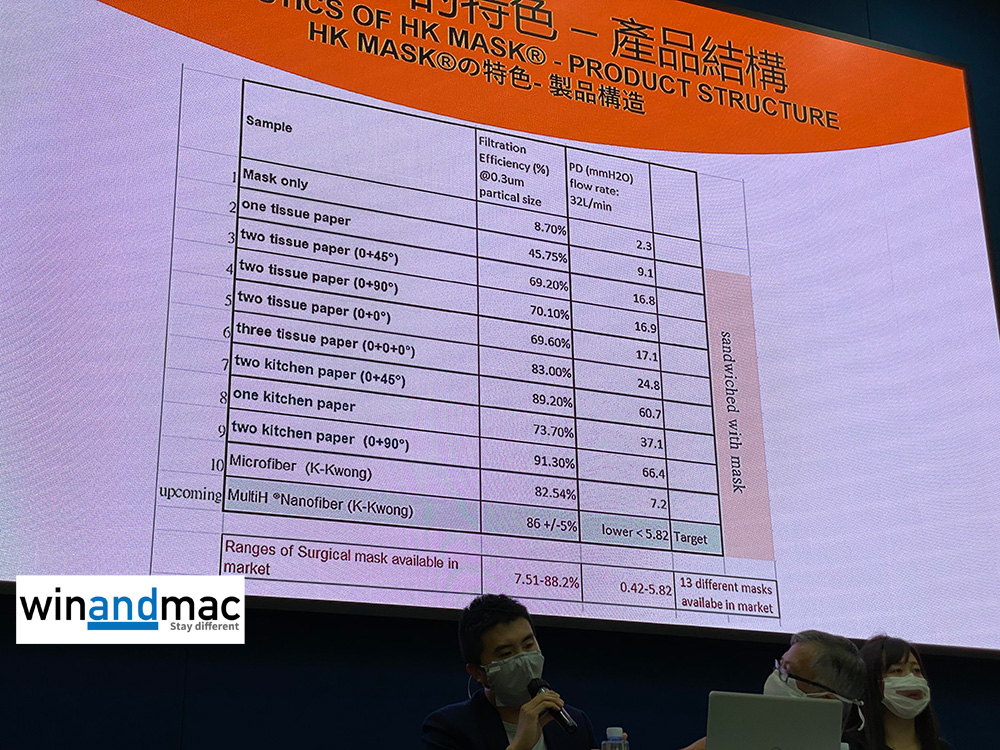若目前未有濾芯,大家可以暫時用廚房紙巾、袋裝紙巾、Microfiber等取代,最好當然是用稍後會推出的Nanofiber。從上述的測試圖表可看到,第二行是過濾能力,至於第三行是則是壓力,數字越低呼吸越順。Dr. K Kwong提到只有第二行數字高沒有意思,因為用保鮮紙可以做到100%,但第三行壓力會極高,亦即無法呼吸。故此,Nanofiber第二行數字高之餘,第三行壓力數字不高很適合配戴。當中的測試使用0.3微米標準已很高,因為病毒和細菌都是沾在飛沫上,遠大過有關標準。若能隔到0.3微米達70%或以上已很好。