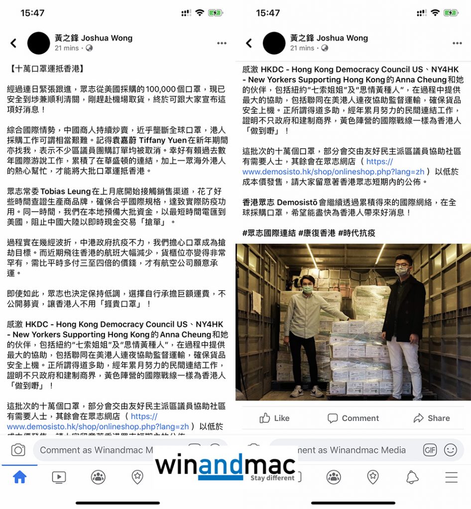 黃之鋒成功從美國購買十萬個口罩  將由民主派區議員分給有需要人士