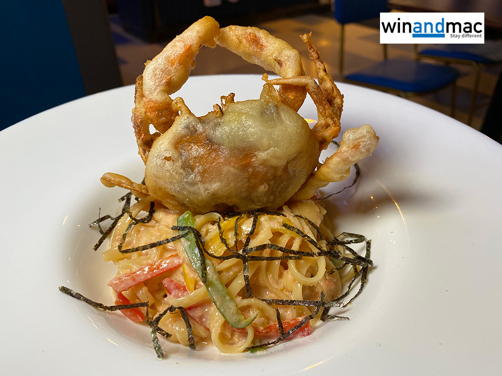 酥炸軟殼蟹明太子忌廉汁扁意粉的特色,不只是上面有一隻蟹,而是意粉的醬汁味道,選擇混合明太子是一個很另類的點綴,相信這就是日意餐廳的fusion特色。