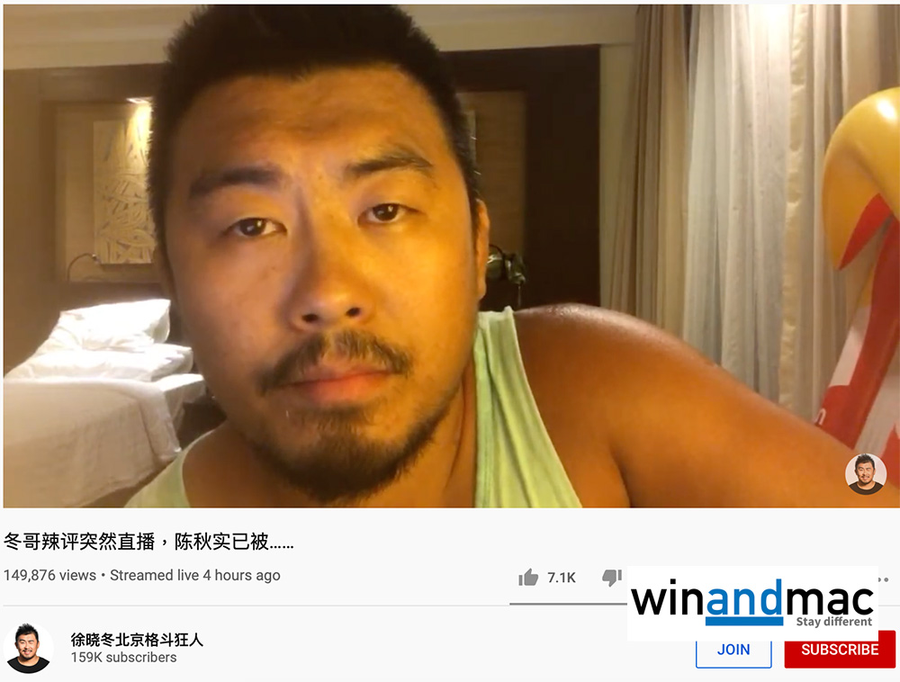 曾經公開表示「不相信香港人是暴徒」,並指抗爭的年輕人都是有為的年輕人的北京格鬥狂人徐曉冬,剛於昨天晚上在YouTube做直播。他本身是目前失蹤的律師兼公民記者陳秋實的緊急聯絡人,於YouTube公佈一系列的第一手消息,並指「豁出去」,讓全世界知道陳秋實不是「大外宣」(意指為共產黨派出去做文宣)。