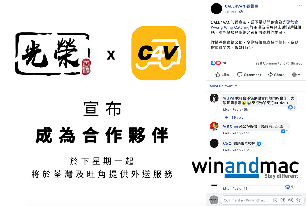 早前瓏瓏van計劃似乎有點失望,另一邊箱CALL4VAN於數小時前宣佈與光榮飲食合作,下星期會開始試行推出送餐服務,首階段只做荃灣及旺角分店,若服務順暢之後將希望拓展到其他地區。
