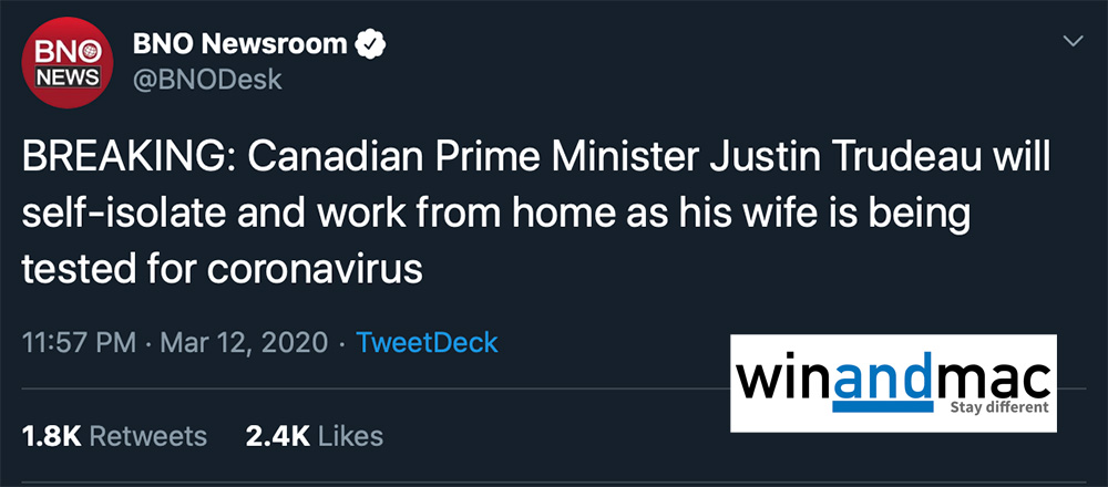 BNO News和外國多間媒體都有相關報道,由於杜魯多應該算是緊密接觸者,現先自我隔離全為謹慎起見。