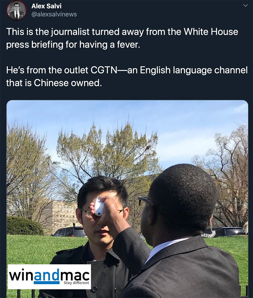 美國白宮較早前舉行記者會時,發生了一段離譜事情。一名CGTN(亦即CCTV央視英文台,中國官方媒體)大陸人記者,本身沒有戴口罩之餘,在入場時竟然高燒至華氏99.9度,若以我們常用的單位,亦即攝氏37.72度,為嚴重高燒。CNN白宮記者隊伍和OANN的記者都證實有關事件。