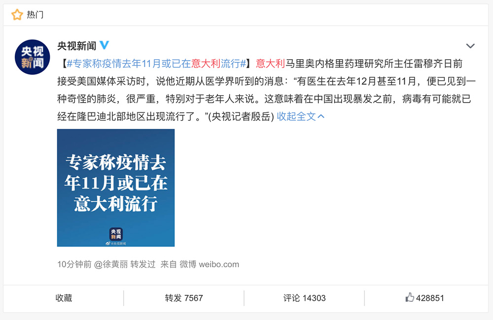 今天中國大陸多個傳媒,以及一些被中國政府控制的英文傳媒,開始聲稱引述一位意大利研究所主任消息,指意大利於11月知道有一種奇怪的新肺炎,而且很嚴重。他們續指,這意味著在中國爆發前,病毒就已經在意大利出現。