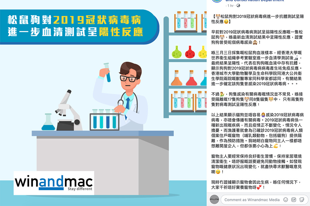 漁護署強調狗隻感染情況不常見,他們稱受隔離的17隻狗隻和8隻貓隻,只有2隻狗隻對病毒測試呈陽性反應。他們也稱,貓狗並不容易感染有關病毒,又指不會傳播病毒。漁護署強調,沒有證據證明顯示寵物會因此生病,提醒不要棄養寵物。不舒服的時候,就要避免與寵物接觸。
