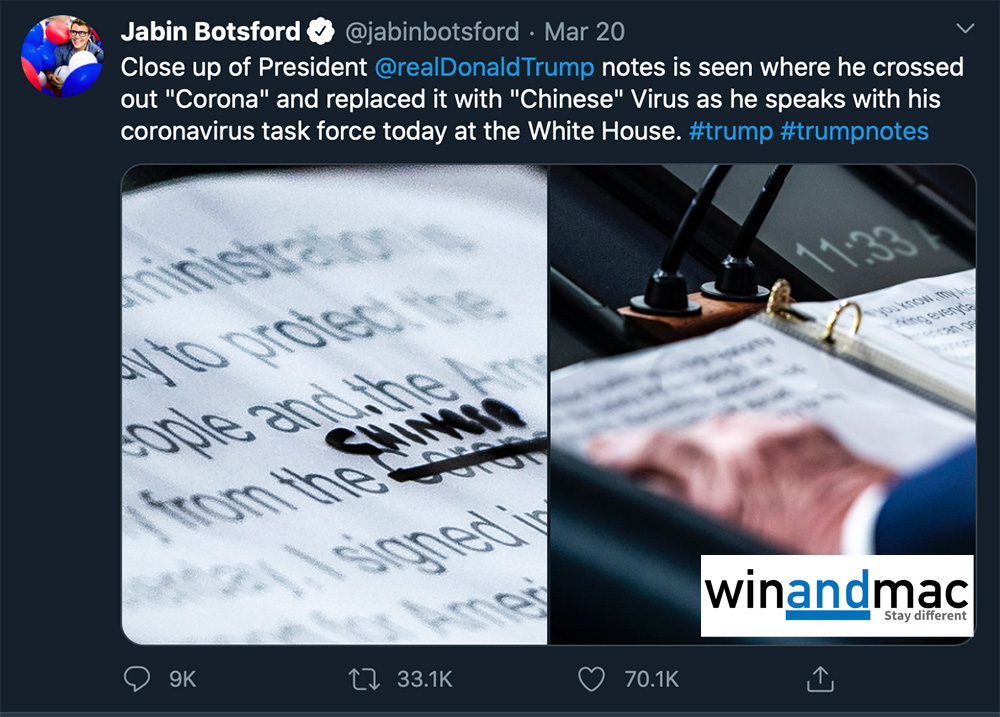 華盛頓郵報攝影記者Jabin Botsford拍到一個有趣的情況,發現特朗普的筆記上,明明寫住Coronavirus,卻被人用人手剷走變成Chinese virus中國病毒。