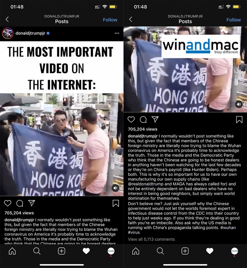 雖然美國總統特朗普Donald Trump經常說跟中國習總是好朋友,但侵侵的行為大家都知道是暗串定真朋友。侵侵最大的兒子Donald Trump Jr.在Instagram上發佈一段影片,當中可以看到是早前香港手足拿著香港獨立旗,大叫「Donald Trump Don’t Trust China. China is an ***hole」。Donald Trump Jr. 直指以前不會放上這些影片,但字裏行間比父親Donald Trump更直接指責中國。