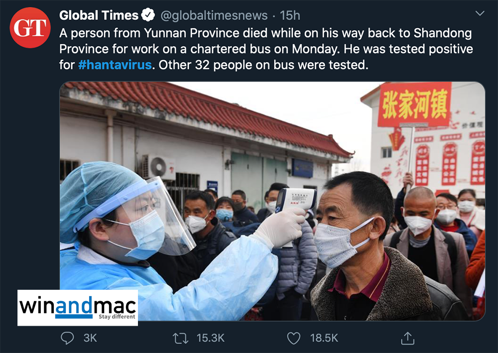 大陸武漢肺炎表面上看起來好轉,但實際情況無人知道是真是假。就在這個時候,大陸官媒Global Times報道,一名雲南人返山東時,突然不適,後來搶救不治死亡,並證實他感染漢他病毒。車上其他人都有檢驗,其中有2個人發燒,但全部人都對武漢肺炎的反應呈陰性,至於漢他病毒測試則還未有公佈結果。