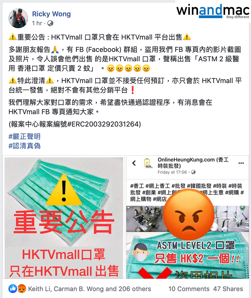 自從武漢肺炎疫情肆虐後,發國難財的人其實一直都沒有停止。最近HKTVmall宣佈將開始製作口罩,有人竟然盜用他們HKTVmall口罩的圖片之餘,還聲稱出售「ASTM 2 級醫用 香港口罩 定價只賣 2 蚊」 ,令人誤會是與HKTVmall有關。HKTVmall王維基在Facebook公佈有關消息,並似乎已經報案處理。
