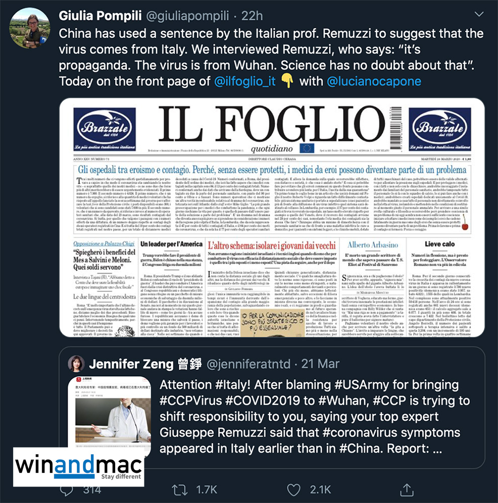 記者Giulia Pompili訪問了Giuseppe Remuzzi,再問一次這位專家有關武漢病毒的問題。Remuzzi直指中國和中國香港傳媒亂譯是黨媒洗腦的行為,不用質疑病毒是來自武漢,科學上也對此沒有其他質疑。有關報道放在當地報章Il Foglio頭版。