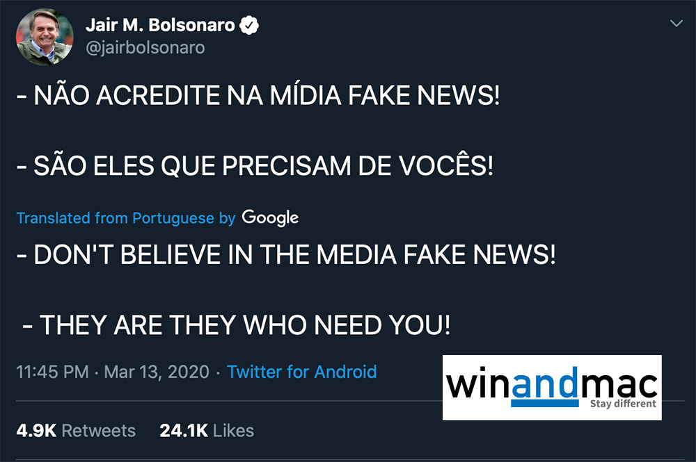 Jair Bolsonaro曾經在公開場合稱,武漢肺炎廣泛流傳只是無謂的幻想(fantasy)。數天前,他還曾經與美國總統特朗普會面。雖然Jair在Twitter上大罵「DO NOT BELIEVE IN THE MEDIA FAKE NEWS!」叫大家不要相信假新聞,但其實巴西通訊部長Fabio Wajngarten早前真的證實染上武漢肺炎。