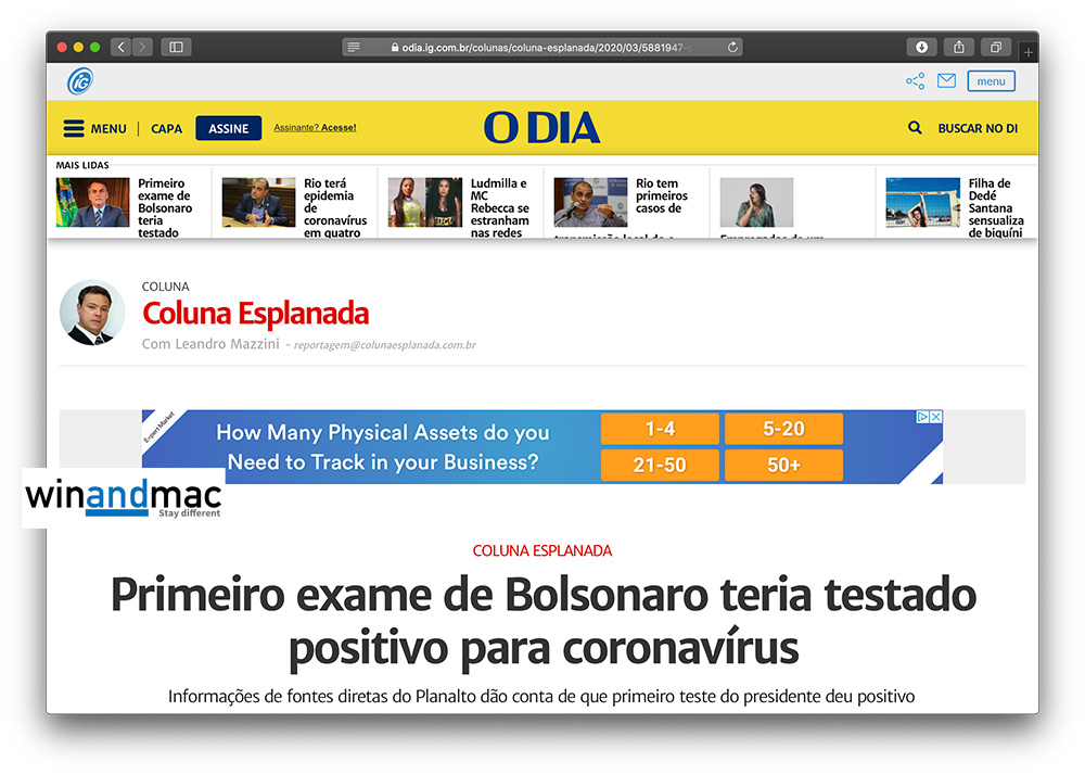 有巴西傳媒包括O Dia報道,稱有巴西侵侵之稱的巴西總統Jair Bolsonaro,證實患上武漢肺炎。若果消息屬實,將會是全球第一個國家元首中招,故此有關報道一出,不少人都瘋傳,Fox News後來也聲稱確認消息。可是,這位狂人Jair Bolsonaro在數分鐘前,於Twitter上發炮,稱這些都是FAKE NEWS(假新聞)。