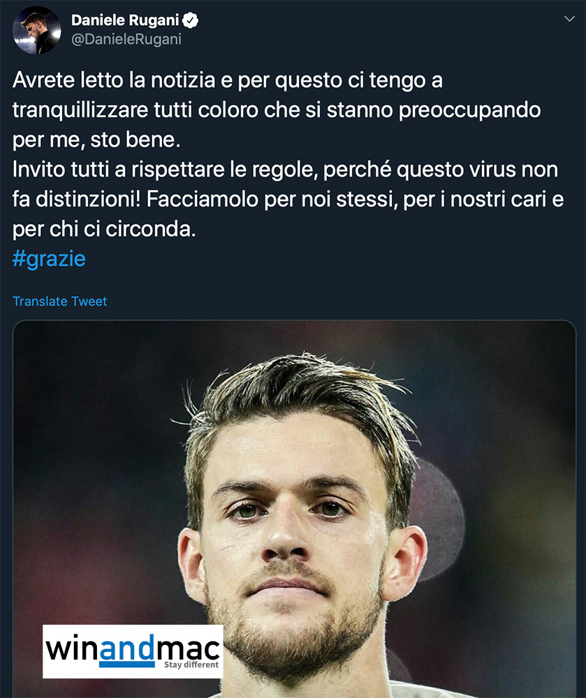 意大利甲組足球聯賽的足球隊祖雲達斯,其後衞魯加尼Daniele Rugani確診患上武漢肺炎。祖雲達斯在官方網站已經公佈有關消息,指魯加尼目前並無任何病徵,但已按法律要求下進行隔離程序,包括曾經與他接觸的人。