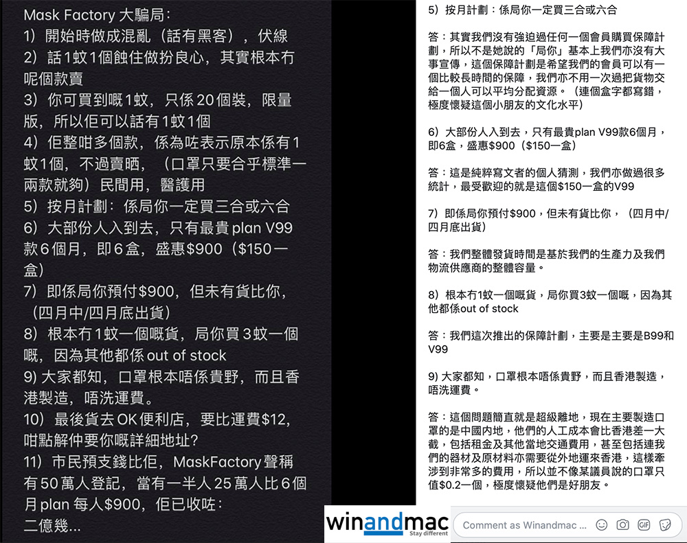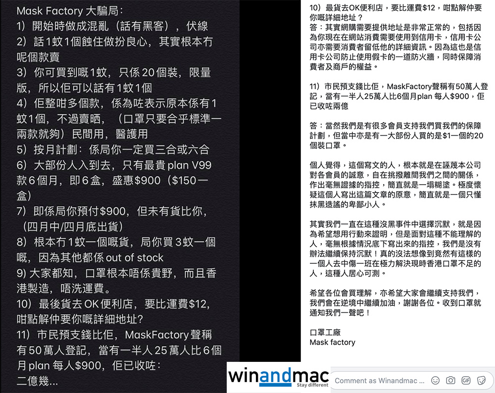 目前市面上多了很多人想做口罩,但很多都是預售形式,有不少一預售就有大量問題,不止是Mask Factory口罩工廠有遇到。不過,很多人質疑Mask Factory口罩工廠的背景之餘,亦有不少網民在一些討論區指責,稱Mask Factory口罩工廠是一個大騙局。就此,Mask Factory口罩工廠終於在網上逐點回應。