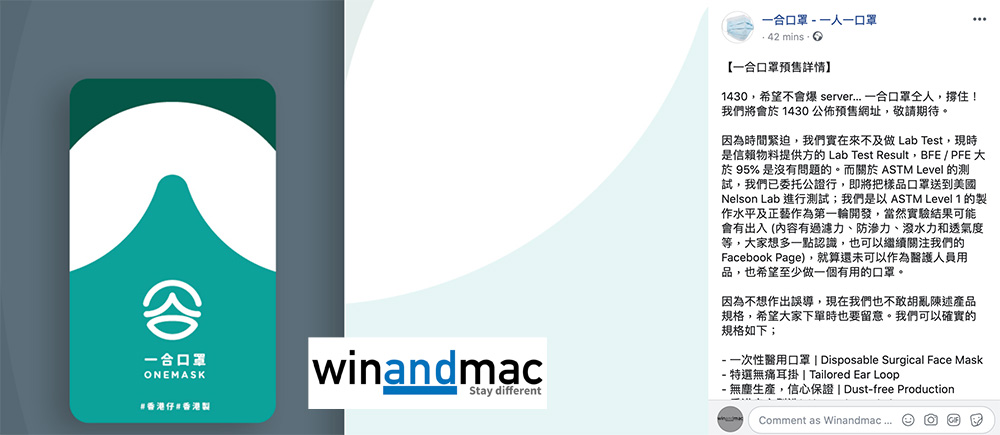 近來的口罩供應好像好了一點,但始終疫情未受控,難保日後會有人再搶口罩。香港目前有不少人都想生產口罩,一合口罩就是其中之一。他們會於今天2:30pm公佈預售詳情,希望一人一次訂購。他們將於四月中正式投產,貨品將於五月中完成。