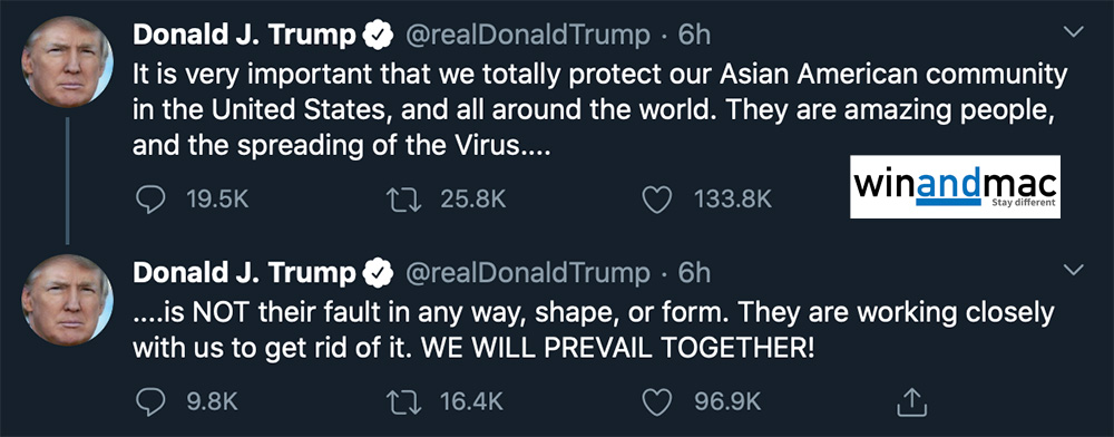 他強調會保障和保護這些亞裔美國人,無論是在國內或全球任何一個地方。特朗普稱他們是好人,病毒擴散不是他們的錯。亞裔美國人與他們都一齊去對抗病毒,應付今次的疫情。