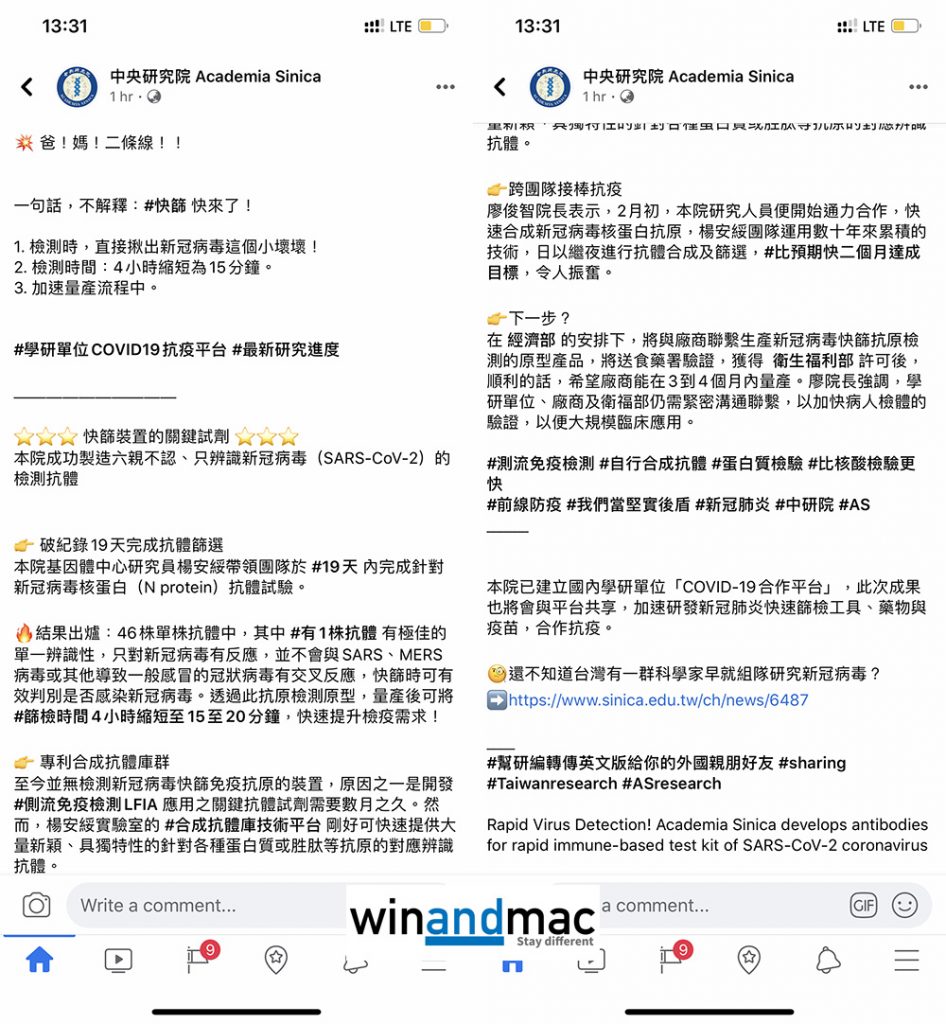 雖然世界衛生組織仍然因為政治原因拒絕台灣抗疫,還謝中國隆恩,但台灣沒有因此放棄,繼續在抗疫工作上努力。台灣中央研究院今日公佈,他們直接找到武漢肺炎的「小壞壞」,以更快方式去檢查,可以由原本要花費4小時,縮減至15至20分鐘。若不幸中招,更會顯示兩條線。