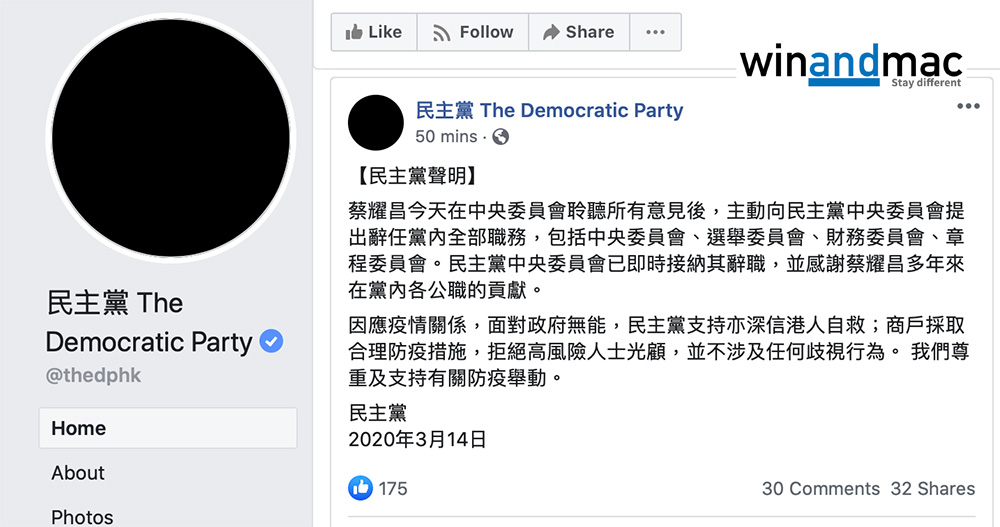 民主黨蔡耀昌早前與平機會見面,竟然做了建制派會做的事,希望禁止餐廳歧視大陸人,不准他們貼告示不招待大陸人。事件發生後民主當割席,如今經會議後,蔡耀昌向民主黨中央委員會提出辭任黨內全部職務,但不退黨。當中辭去職務包括中央委員會、選舉委員會、財務委員會、章程委員會,民主黨中央委員會已即時接納。